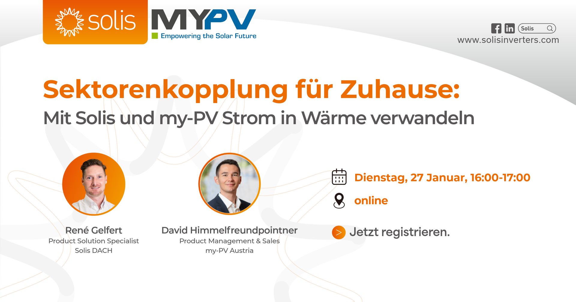 Want to learn more about how my-PV’s solar-electric solutions can be used with Solis inverters? Then register now for the partner webinar, conducted by experts from both companies. It will take place on Tuesday, January 27, 2026, at 4:00 PM